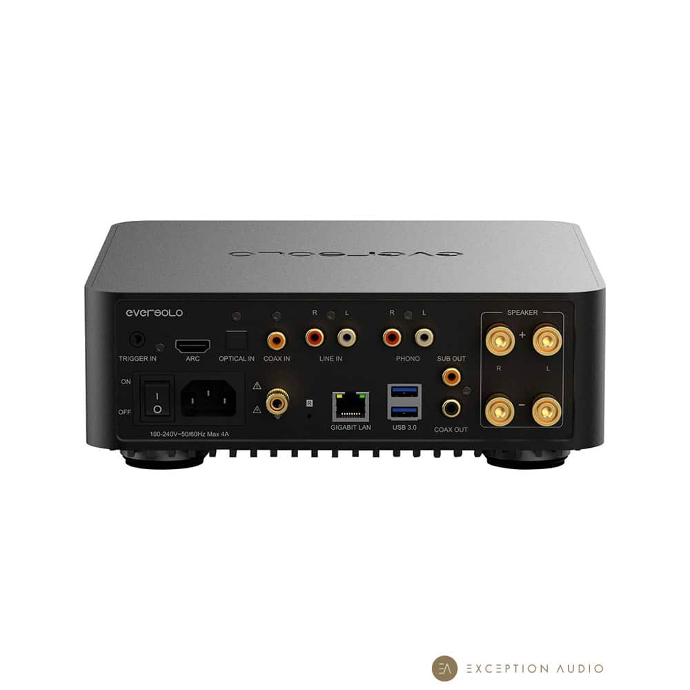 L’EverSolo Play est un amplificateur intégré connecté conçu pour offrir à la fois puissance, polyvalence et simplicité d’utilisation. Il délivre jusqu’à 110 watts par canal sous 4 ohms. Basé sur le même logiciel que les lecteurs réseau EverSolo, il donne accès aux principaux services de streaming musical tels que Qobuz, TIDAL, Spotify ou même Apple Music, et prend également en charge la diffusion Bluetooth ainsi que l’intégration Roon. Son DAC AKM assure une restitution précise et détaillée, avec une compatibilité aux fichiers audio haute résolution jusqu’en PCM 32 bits / 768 kHz et DSD512 natif. Très complet, l’EverSolo Play dispose d’une connectique complète permettant de raccorder aussi bien des sources analogiques que numériques, y compris un téléviseur via HDMI ARC ou une platine vinyle. Pour les amateurs de supports physiques, la version EverSolo Play CD Edition intègre un lecteur CD.